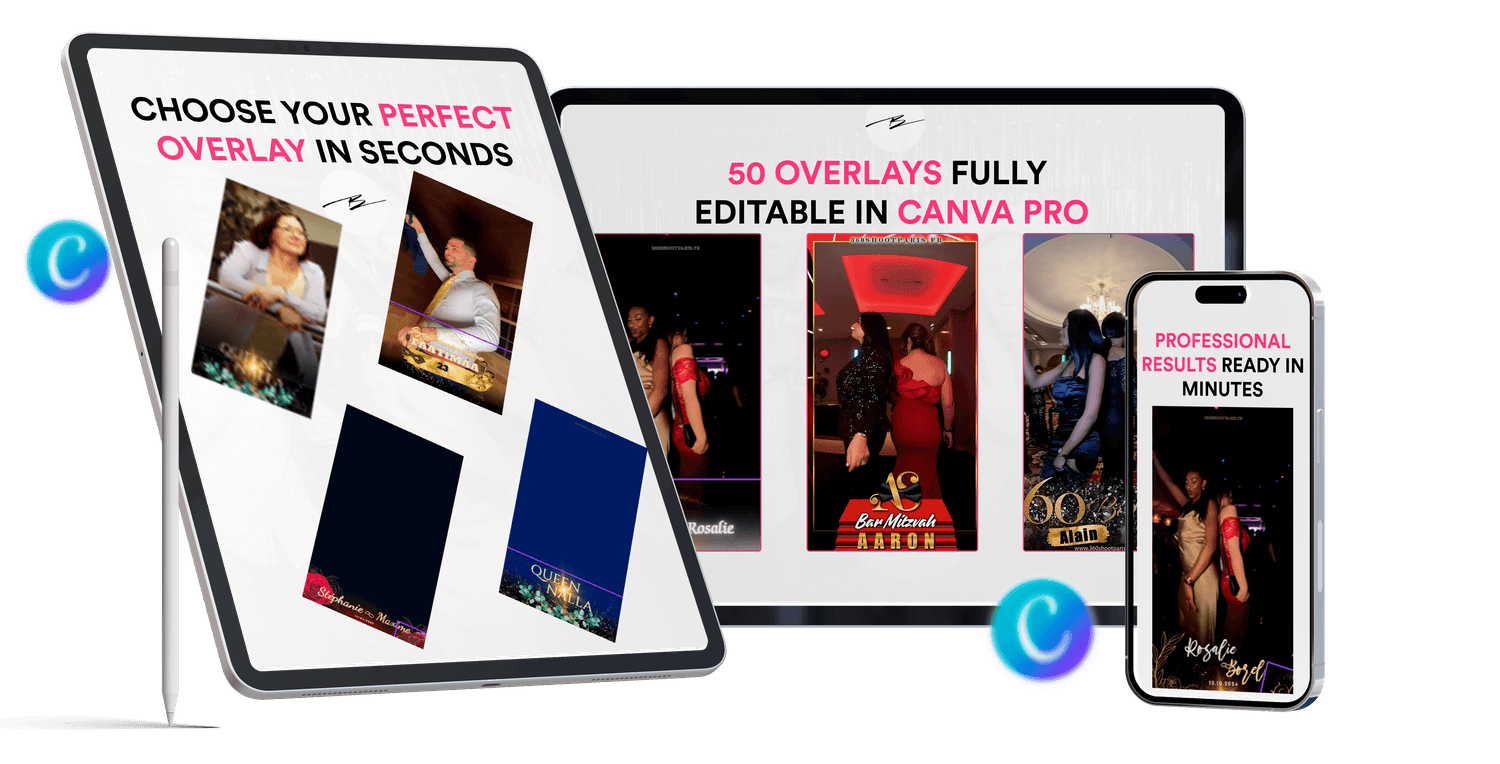A bundle of 50 editable overlays for all types of events (weddings, birthdays, proms, baby showers, bar mitzvahs, holidays...)